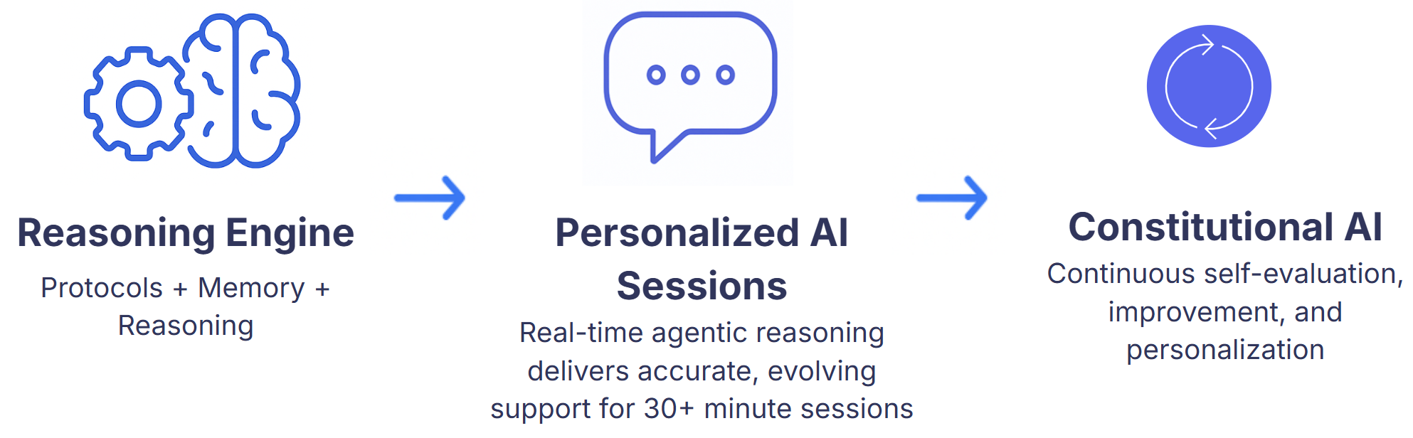 Real-time reasoning, guided by memory and evidence-based protocols — eliminating hallucinations, preventing drift, and enabling continuous personalization and improvement.